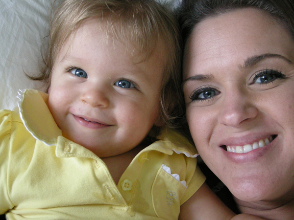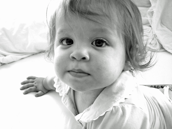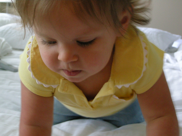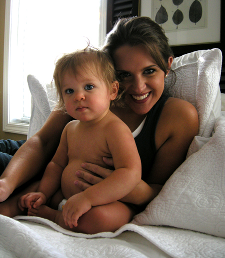 When I get home in the afternoons from work, it’s not always easy thinking of things to keep Brittain entertained. We play, read, take wagon rides, practice standing up, practice walking, eat…but sometimes I get to a point where I feel like both of us are bored. Since Brittain was born, whenever we feel like this, we always do the same thing – we gravitate to Mommy and Daddy’s king-sized bed. I don’t know what it is about this bed, but Brittain LOVES it. We can watch Baby Einstein DVD’s, we can roll around and laugh, we can look out the windows…it doesn’t matter what we do, we have fun! It’s not uncommon for us to spend an hour or more rolling around and laughing in the afternoons (I can’t believe Dan EVER wonders how we spend our time :-)). As Brittain and I played the other day, I figured there was no better moment than this to catch some great shots. I adore these pictures, and it may just be because when I look at them, I think back to that day and all the other fun days that we spend together. Regardless of the reason, I just love them: