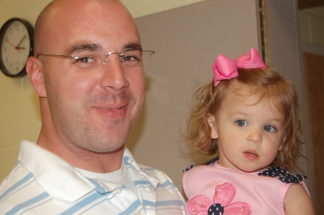 Daddy put on a smile despite his mouthful of food: