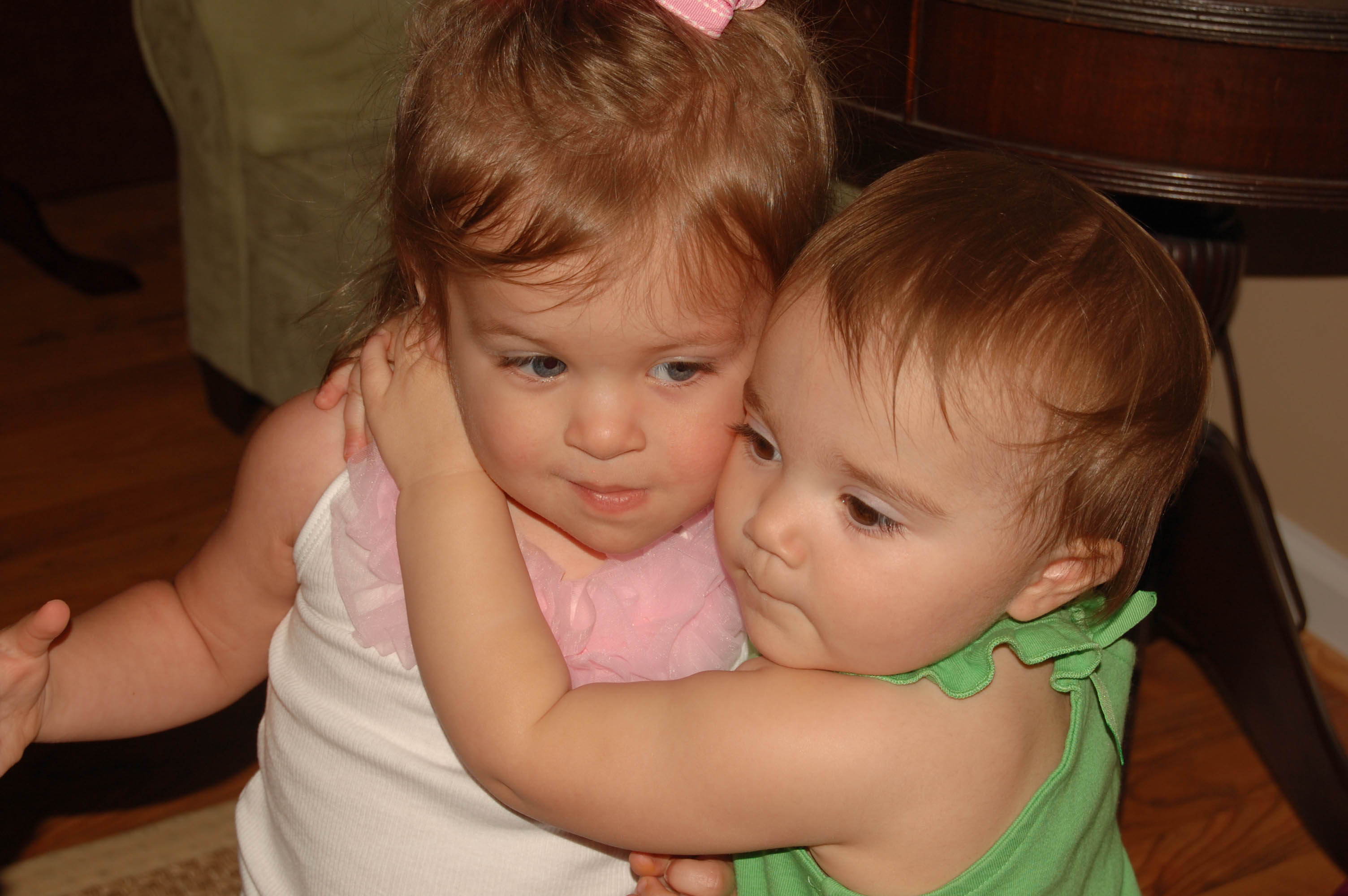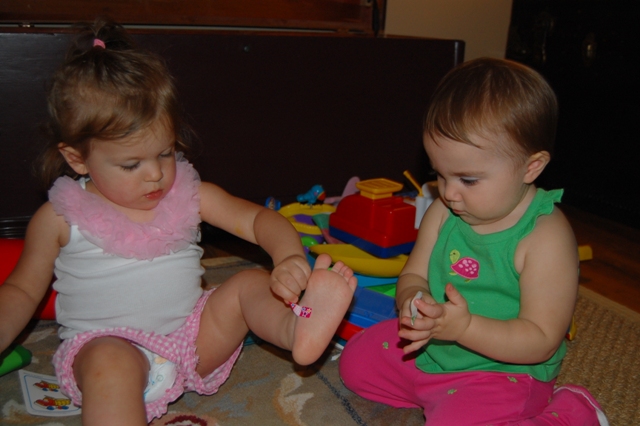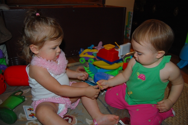 I’ve been intrigued as I’ve watched other children’s personalities who are around Brittain’s age. I figured that Ava would probably be a lot like Brittain. Like Brittain, Ava hasn’t gone to daycare. Since she was born she’s been in the care of her parents, Jenny’s mother, or Jenny’s grandmother. So, I have to admit that I was a little surprised when the Parkers arrived and I saw Ava’s confidence and invincible attitude. When Ava walked into the house you could see Brittain giving her the “once over.†She was taking her time, looking her over, checking her out, making sure she wasn’t a serial killer. Ava, on the other hand, ran straight up to Brittain to greet her with a huge hug. You could tell that Brittain was a little uncomfortable with this straightforwardness (is this a word?), but she allowed it. The unfortunate part of this moment happened when both girls lost their footing and fell to the floor. Neither of them were hurt in the least. In fact, Ava immediately jumped back up and went onto something else. Brittain, however, acted as if she had broken a limb on the way down and she would never recover. I did what any mother would do. I picked her up and comforted her, but I found myself in an awkward situation. While I wanted to say, “Baby. It’s okay. Mommy’s here. Let me hold you and comfort you and make it all better,†I also found myself attempting to have the nonchalant mother attitude like, “ha ha ha. what in the world? you’re okay. nothing’s wrong with you. you NEVER do this!” Let me tell you, it’s difficult to do both of these at the same time. After about a half hour of consoling, Brittain seemed to be okay and was ready to get back in the game. The funny part is that Ava continued to be affectionate and was determined to let Brittain know how much she cared. After the first hug that resulted in the tumble to the floor, we saw that Brittain was apparently NOT into this. The rest of the evening was spent with Ava having the time of her life (while showing her adoration to Brittain) and Brittain keeping a safe distance from Ava while watching her out of the corner of her eye to make sure she didn’t get too close.