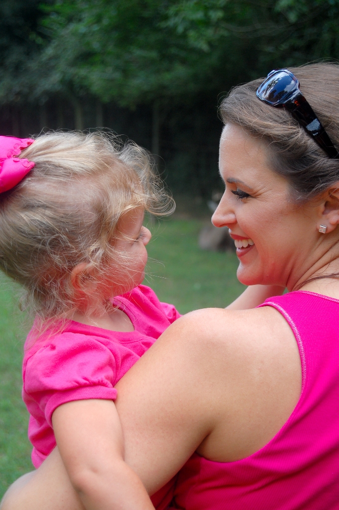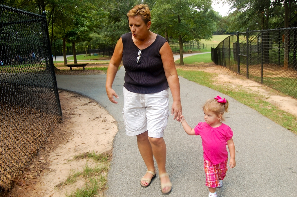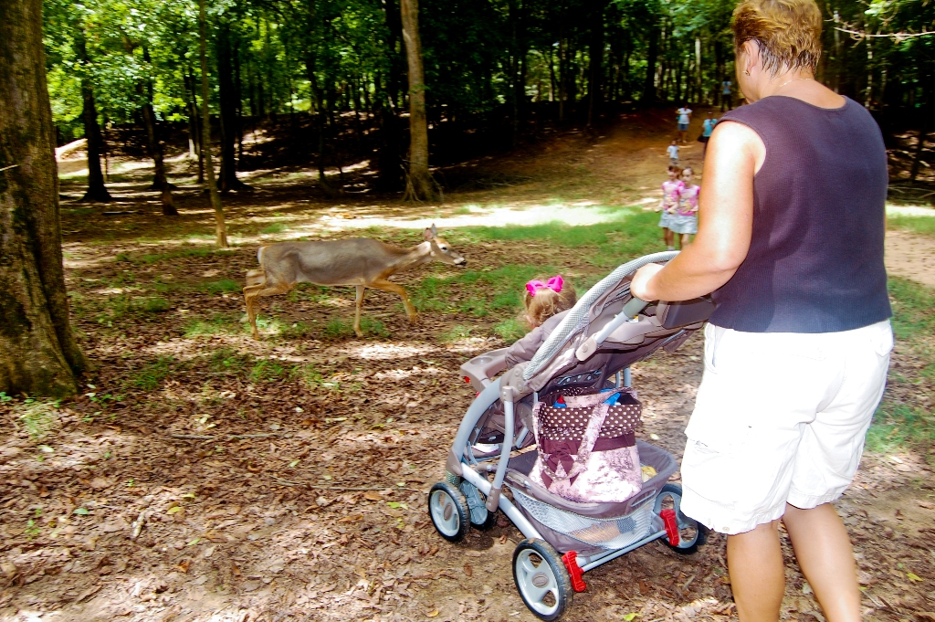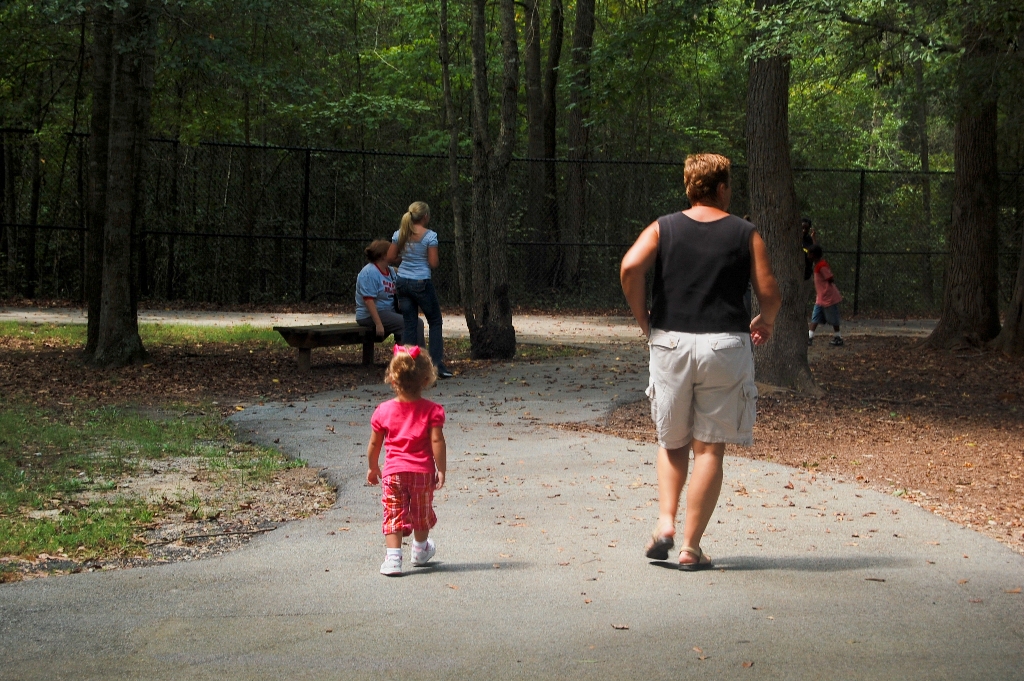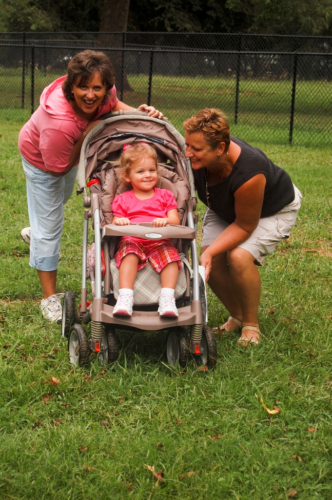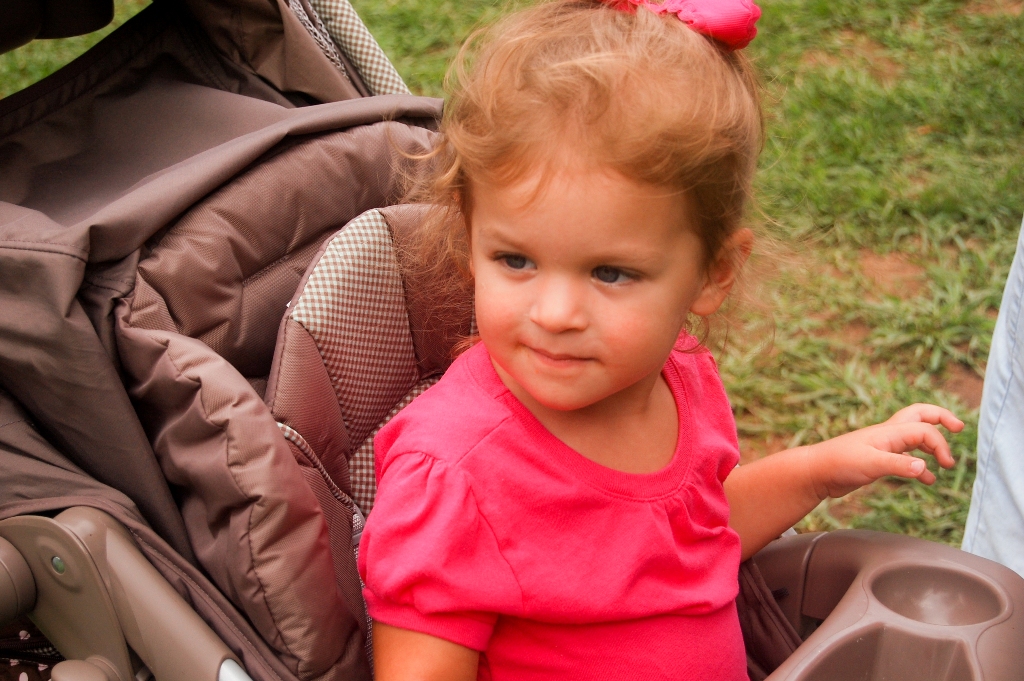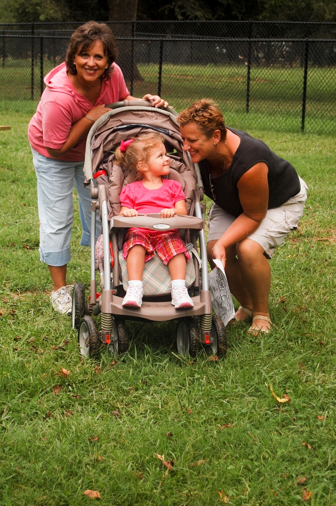 I’m sure we were quite a sight as we got out of the car and unloaded everything we would be taking on the trail with us. Fortunately, Amanda gave me the advice to bring a stroller. The stroller ended up not only being Brittain’s “throne” as we walked along the paths, but it also carried her potty chair in the event she needed to take a potty break along the way. And, in case you’re wondering, we did indeed have to stop for a potty break. As if the potty in the stroller didn’t cause us to stand out in the crowd enough, we also took a moment in a semi-wooded area to let Brittain tee tee. Trying to make sure she had some privacy, here were 3 women hovered around a 2-year old on a small, white potty chair, cheering loudly when we heard the sound of the tinkling.
