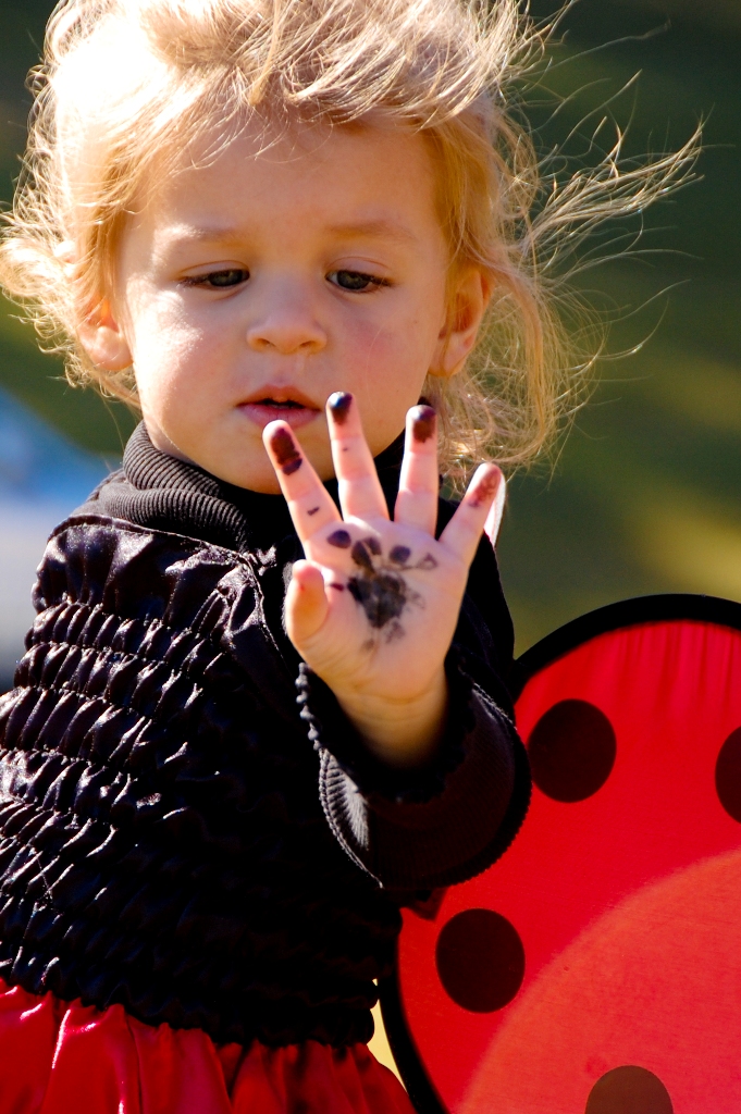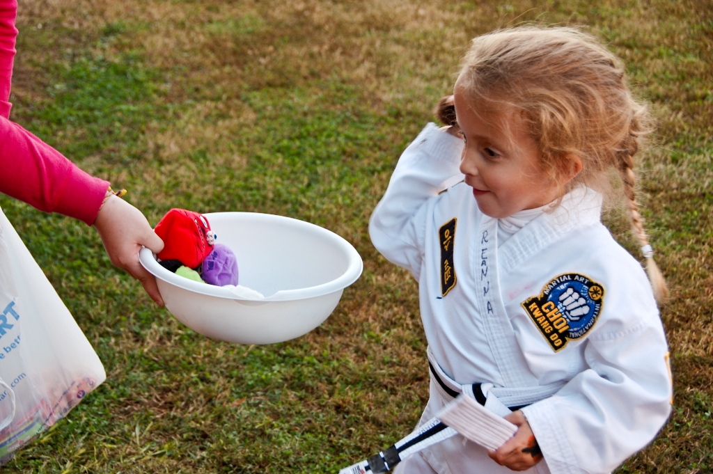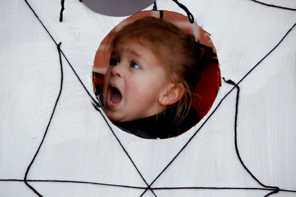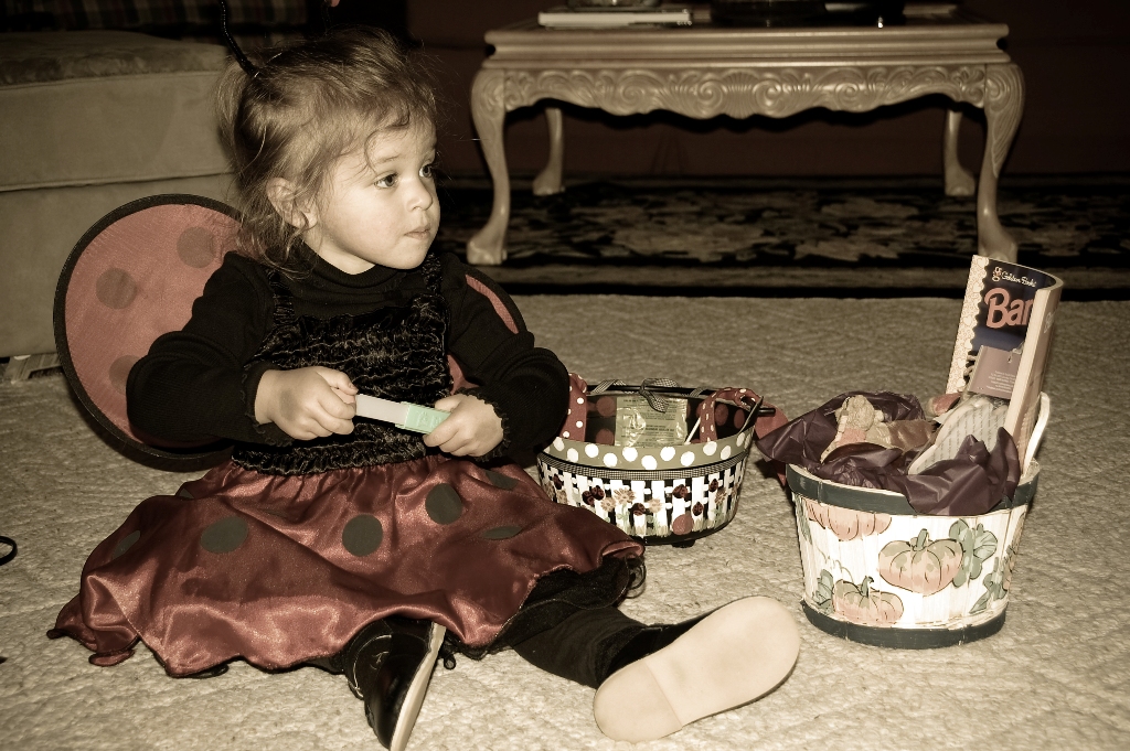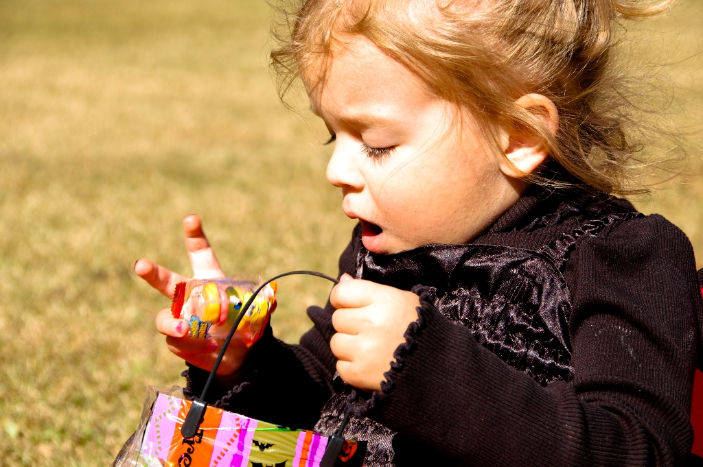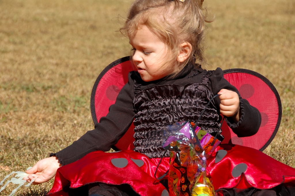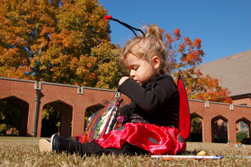 When the party ended, Brittain and I hung around the church for a while so I could take some more pictures. She was totally content looking through her goody bags. Who would know that 12 different spider rings could thrill a person so much?